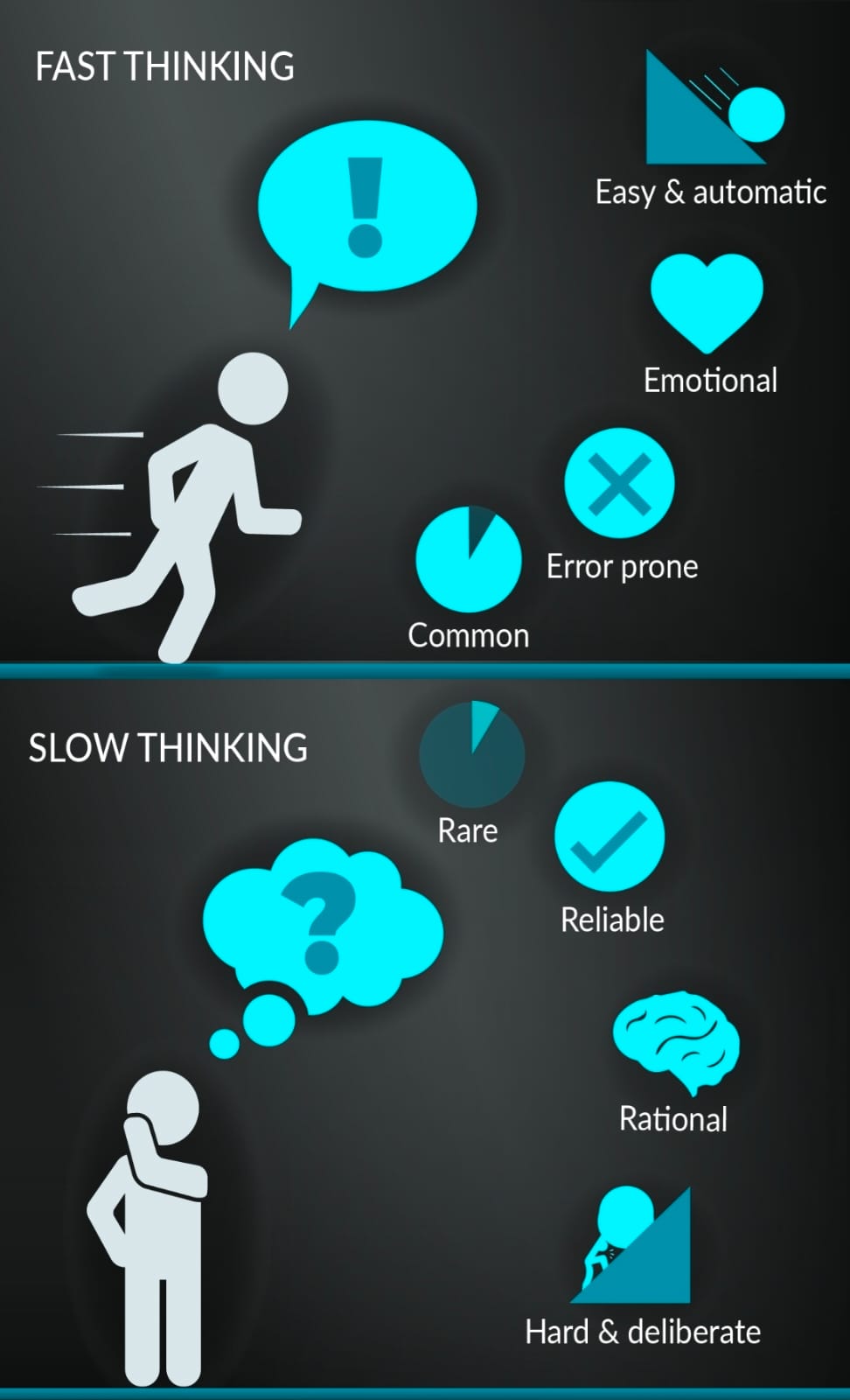 तेज सोच हमारे जीवन में बहुत उपयोगी है। यदि हमें हर छोटी बात पर गहराई से सोचना पड़े, तो जीवन कठिन हो जाएगा। उदाहरण के लिए, ड्राइविंग करते समय अचानक सामने आई बाधा पर तुरंत प्रतिक्रिया देना सिस्टम-1 का ही काम है। लेकिन यही तेज सोच कभी-कभी भ्रम या पूर्वाग्रह का शिकार भी हो सकती है। हम अधूरी जानकारी के आधार पर गलत निष्कर्ष निकाल लेते हैं।